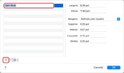 Clique em [+] no canto inferior esquerdo, clique em [Sem título] e digite o nome do papel de tamanho personalizado.