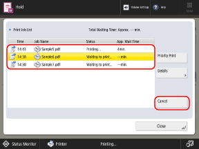 Você pode cancelar a impressão na tela da UI Remota exibida selecionando [Status Monitor/Cancel] [Copy/Print] [Job Status]. Verificando o uso e os registros com a UI Remota
