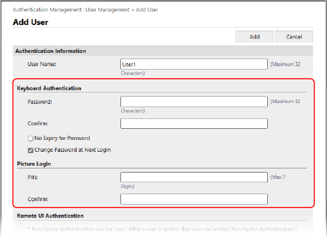 Em [Keyboard Authentication], configure a senha a ser inserida quando fizer login. Insira a mesma senha em [Password] e [Confirm].