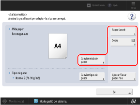 Si hi ha paper carregat a la safata multiús, apareixerà la següent pantalla al tauler de control. Configureu la mida i el tipus de paper segons el paper carregat.