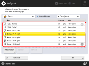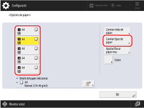 El tipus de paper predeterminat és Normal 1 o Normal 2. Quan es carregui paper d'un altre tipus o quan la mida que es mostra al tauler de control sigui diferent a la del paper carregat, canvieu els paràmetres del paper.