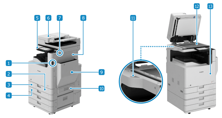 Podrobnosti o konfiguraci přístroje, pokud je nainstalováno příslušenství, a názvy součástí jednotek volitelného zařízení naleznete v následující části.