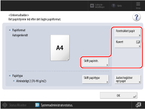 Når der er lagt papir i universalbakken, vises skærmen til indstilling af papiret som standard på betjeningspanelet. Indstil papirstørrelsen og -typen i overensstemmelse med det ilagte papir.