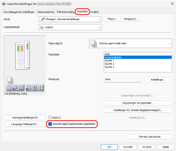 Gå til fanen [Papirkilde], og vælg [Anvend også begrænsede papirkilder]-afkrydsningsfeltet.