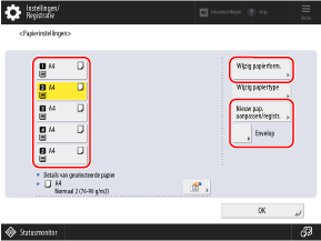 De papiersoort is standaard ingesteld op Normaal 1 of Normaal 2. Als er papier van een ander type wordt geplaatst of als het formaat dat op het bedieningspaneel wordt weergegeven afwijkt van het geplaatste papier, wijzigt u de papierinstellingen.