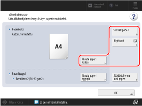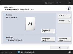 Kun monitoimitasolle lisätään paperia, käyttöpaneelissa näkyy seuraava näyttö. Aseta paperin koko ja tyyppi lisätyn paperin mukaan.