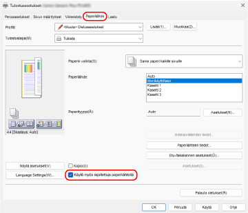 Merkitse välilehdellä [Paperilähde] valintaruutu [Käytä myös rajoitettuja paperilähteitä].