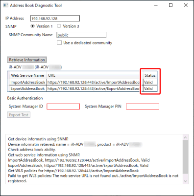The Web service of the printer must be enabled to manage the address book of the printer using this software. If [Invalid] is displayed in the [Status] field when [Retrieve Information] is clicked in the Address Book Diagnostic Tool, perform the following operation.