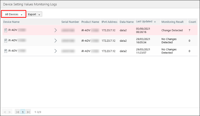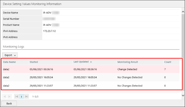 执行 [Device Setting Values Monitoring Logs] 页面上列表中的必要操作。