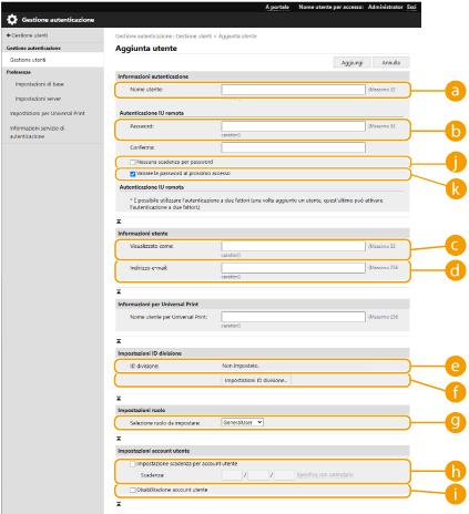 dc | No | Da 0 a 32 caratteri | Caratteri di controllo | - (N/D) | Impossibile modificare. Viene assegnato automaticamente per i seguenti utenti. Utenti registrati tramite autenticazione server |