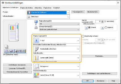 3 | Stel tijdens het controleren van het afdrukvoorbeeld [Pagina-opmaak] [Paginavolgorde] [Enkelzijdig/Dubbelzijdig/Boekje afdrukken] [Inbindlocatie] in. |