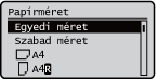 A gyakran használt papírméreteket az <S1> – <S5> gombokhoz társítva később könnyedén előhívhatja ezeket a <Bejegyzett méretek> lehetőség kiválasztásával.Szabad méretű papír bejegyzése (egyedi méretű papír)