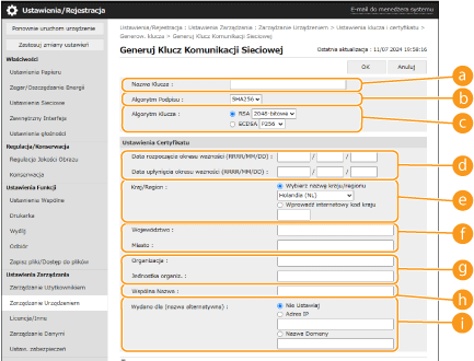 Urządzenie może wygenerować klucz i certyfikat (certyfikat serwera) wykorzystywany do zaszyfrowanej komunikacji TLS. Jeżeli chcesz natychmiast rozpocząć korzystanie z zaszyfrowanej komunikacji TLS, wygodniej jest korzystać z klucza i certyfikatu zainstalowanego w urządzeniu. W razie konieczności, administrator może wygenerować klucz i certyfikat. Należy jednak pamiętać, że zaszyfrowana komunikacja TLS nie jest dostępna wyłącznie po wygenerowaniu klucza i certyfikatu. Konfiguracja klucza i certyfikatu dla protokołu TLS