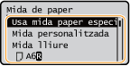 Si us cal canviar amb freqüència el paper que s'ha de carregar, establiu l'opció en <Mida lliure>; d'aquesta manera es redueix el nombre de passos necessaris per canviar l'opció cada vegada. També és possible que es mostri un missatge d'error quan la configuració al controlador d'impressora sigui significativament diferent de la mida del paper carregat.