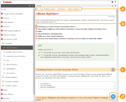 Kullanıcı Kılavuzu için metin boyutu, düzen ve görüntüleme yöntemi gibi ayarları belirtmek için tıklatın.