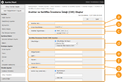 Makine üzerinde bir anahtar ve CSR oluşturabilirsiniz. Ayrıca, CSR verilerini ekranda görüntüleyebilir ve dosya olarak aktarabilirsiniz.