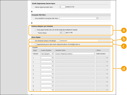 [Göz Atılacak Kullanıcı Özniteliği:] bölümünde belirtilen özniteliğe kayıtlı karakter dizesini girin. Kullanıcının ait olduğu gruba göre ayrıcalıkları ayarlamak için grup adını girin.