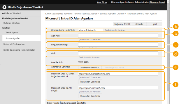 [Microsoft Entra ID Kimlik Doğrulama URL'si:] ve [Microsoft Entra ID API URL'si:]
