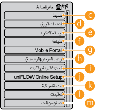 <إعدادات الوظائف>، <التفضيلات>، ويمكن بدء العديد من إعدادات الجهاز الأخرى من هذا الزر.