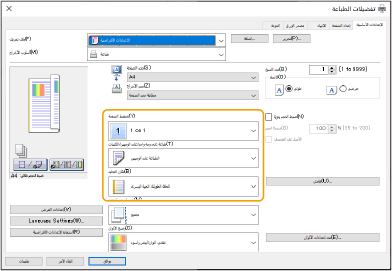 أثناء التحقق من معاينة الطباعة، قم بتعيين [تخطيط الصفحة] [ترتيب الصفحات] [طباعة على وجه واحد/على الوجهين/الكتيبات] [مكان التجليد].
