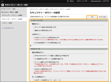 情報セキュリティーに関わる本機の設定を一括して適用/管理することができます。セキュリティーポリシーを管理する情報セキュリティーの担当者は、組織の方針に従って本機にセキュリティーポリシーを適用してください。セキュリティーポリシーを設定するには、Administratorの権限でリモートUIにログインしてください。