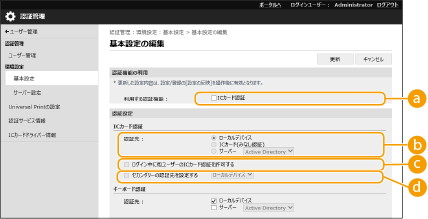 他のユーザーがログイン中の場合でも、ICカードを使って本機にログインできるようにするときはチェックマークを付けます。この機能が有効な場合、ICカードをかざすと先にログインしていたユーザーは自動的にログアウトされます。機能別認証を行っているときは使用できません。
