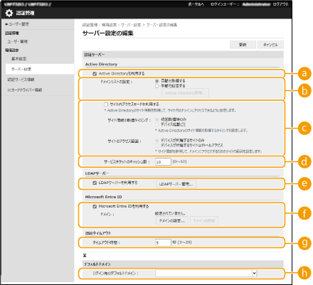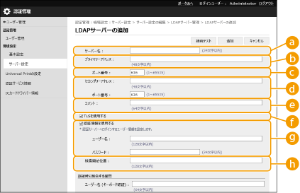 ![]() | Active DirectoryやMicrosoft Entra IDまたはLDAPサーバーを認証サーバーとして追加指定するには、認証時に使用するサーバー情報を登録する必要があります。必要に応じて接続テストを行ってください。 |