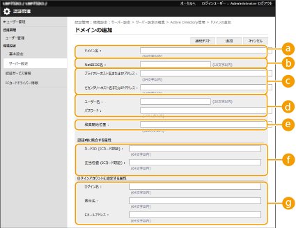 4 | 必要な情報を設定する ![]() [ドメイン名 :]ログイン先となるActive Directoryのドメイン名を入力します(入力例:「company.domain.com」)。 [NetBIOS名]NetBIOSのドメイン名を入力します(入力例:「company」)。 [プライマリーホスト名またはIPアドレス :]/[セカンダリーホスト名またはIPアドレス :]Active Directoryサーバーのホスト名またはIPv4アドレスを入力します(入力例:「ad-server1」)。セカンダリーサーバーを利用するときは、[セカンダリーホスト名またはIPアドレス :]で指定してください。 入力例: ホスト名の場合:「ad-server1」 IPv4アドレスの場合:「192.168.18.138」 [ユーザー名 :]/[パスワード :]Active Directoryサーバーにアクセスして検索を行うためのユーザー名とパスワードを入力します。 [検索開始位置 :]ActiveDirectoryサーバーにアクセスして検索を行う場所を指定します。 [カードID (ICカード認証) :]/[正当性値 (ICカード認証) :]ICカード認証を利用するときは、カードのIDや正当性値(再発行回数)を指定します。 [ログイン名 :]/[表示名]/[Eメールアドレス :]Active Directoryサーバー上で、各ユーザーアカウントのログイン名/表示名/Eメールアドレスが登録されているデータフィールド(属性名)をそれぞれ指定します(入力例:「sAMAccountName」、「cn」、「mail」)。 |