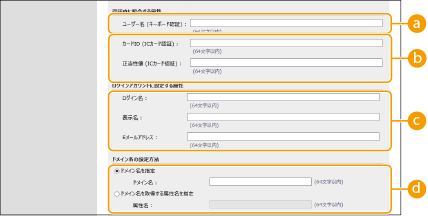 4 | 属性名やドメイン名の設定方法を指定する ![]() [ユーザー名 (キーボード認証) :]LDAPサーバー上で、ユーザー名が登録されているLDAPデータのフィールド(属性名)を指定します(入力例:「uid」)。 [カードID (ICカード認証) :]/[正当性値 (ICカード認証) :]ICカード認証を利用するときは、カードのIDや正当性値(再発行回数)を指定します。 [ログイン名 :]/[表示名]/[Eメールアドレス :]LDAPサーバー上で、各ユーザーアカウントのログイン名/表示名/Eメールアドレスが登録されているLDAPデータのフィールド(属性名)をそれぞれ指定します(入力例:「uid」、「cn」、「mail」)。 [ドメイン名を指定]/[ドメイン名を取得する属性名を指定]ログイン先のドメイン名の指定方法を選びます。ドメイン名を直接指定するときは、[ドメイン名を指定]を選び、ドメイン名を入力します。LDAPサーバー上で、ドメイン名が登録されているLDAPデータのフィールド(属性名)を指定するときは、[ドメイン名を取得する属性名を指定]を選び、属性名を入力します(入力例:「dc」)。 |