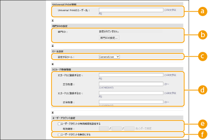 [部門ID :]部門別ID管理を併用するときは、[部門IDの設定]をクリックし、一覧からユーザーを所属させる部門IDを選ぶ必要があります。まず、一覧画面の[新規部門の登録]から必要な部門IDを登録してください。ここで選んだ部門IDを削除したときは、必ず設定を変更してください。