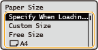 After the default paper setting is registered, the paper setting screen is not displayed when paper is loaded, and the same setting is always used. If you load a different paper size or type without changing the paper settings, the machine may not print properly. To avoid this problem, select <Specify When Loading Paper> in step 3, and then load the paper. |