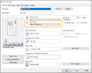 프린터 드라이버의 [출력 크기]와 인쇄할 용지의 크기를 맞춥니다.