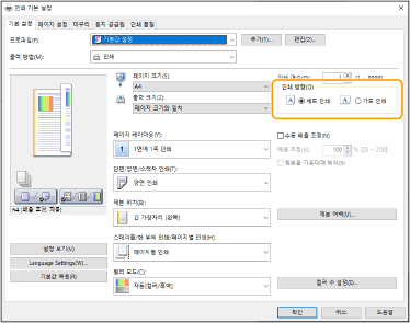 2 | 드라이버의 [기본 설정] 화면에서 [인쇄 방향]을 1단계에서 설정한 것과 같은 방향으로 설정합니다. |
