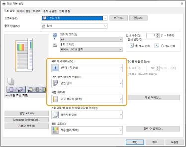 3 | 인쇄 미리 보기를 확인하는 동안 [페이지 레이아웃] [페이지 순서] [단면/양면/소책자 인쇄] [제본 위치]를 설정합니다. |