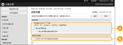 如果选择了[CHACHA20-POLY1305]或[X25519],则无法使用[以FIPS 140-2作为加密方法的格式]。 通过TLS启动远程用户界面如果在启用了TLS时尝试启动远程用户界面,可能会显示与安全证书相关的安全警报。在此情况下,检查在地址栏中是否输入了正确的URL,然后继续显示远程用户界面屏幕。启动远程用户界面 批量导入/批量导出此设置可以使用支持批量导入该设置的模型进行导入/导出。导入/导出设置数据 批量导出时此设置包括在[设置/注册基本信息]中。导入/导出所有设置 |