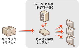 如果设备尝试连接并开始在802.1X网络上通信,则设备必须进行用户认证以证明连接由授权用户建立。认证信息会发送到RADIUS服务器并进行检查,根据认证结果允许或拒绝网络通信。如果认证失败,局域网交换机(或存取点)会阻止来自网络外部的访问。本机可以作为客户端设备连接到802.1X网络。