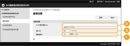 [通信超时:]输入与 SCEP 服务器通信的超时时间。如果在设定时间内没有来自 SCEP 服务器的响应,则取消连接。
