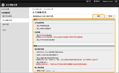 可以批量应用和管理与信息安全相关的本机设置。建议负责管理安全策略的信息安全管理员遵照组织策略对本机应用安全策略。要配置安全策略,请以“管理员”权限登录到“远程用户界面”。