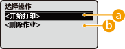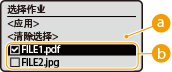 在 <切换作业列表> 屏幕上选择 <应用> 后,可以选择 <选择作业> 屏幕上的文档。可以打印或删除选定的文档。