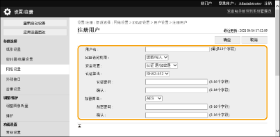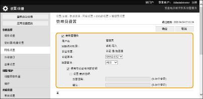 1 | 单击[管理员设置]。 ![]() [使用管理员] 选中此复选框以使用管理员用户。 [认证算法] 和 [加密算法] 无法更改。 [使用与认证相同的密码] 选中复选框以使用与在用户认证中所使用的密码相同的密码。 | ||||