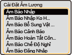 <Âm Báo Chế Độ Nghỉ> | Âm thanh phát ra khi máy chuyển sang chế độ nghỉ hoặc khi máy TẮT nếu bạn cài đặt <Cài Đặt Khởi Động Nhanh cho Nguồn Chính> thành <Bật>. (Tùy từng trường hợp, máy không khởi động nhanh chóng và không phát ra âm báo.) |