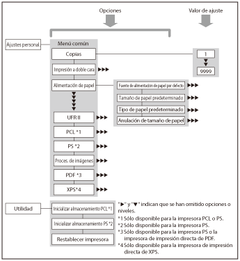 El menú Opciones de impresora permite acceder a opciones comunes. A continuación se muestra un esquema abreviado de la estructura del menú Opciones de impresora.