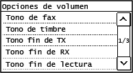 [Tono de fax] / [Tono de timbre] / [Tono fin de TX] / [Tono fin de RX] / [Tono fin de lectura]