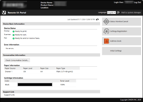 Khi bạn đăng nhập vào Remote UI, trang Cổng thông tin (trang đầu của Remote UI) sẽ xuất hiện. Từ đây bạn có thể kiểm tra tình trạng vận hành của máy, xem các thông tin khác nhau, và thay đổi cài đặt với các thao tác nút.