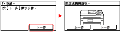 如果本機卡紙,控制面板上會出現 [夾紙。]。請按照顯示的指示清除卡紙。