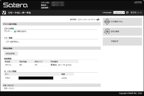 リモートUIにログインすると、ポータル画面(リモートUIのトップページ)が表示されます。本機の稼働状態や各種情報を確認したり、ボタンをクリックして設定を変更したりできます。
