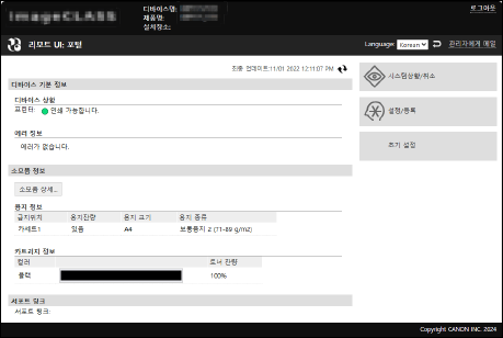 리모트 UI에 로그인하면 포털 페이지(리모트 UI 상위 페이지)가 나타납니다. 여기서 기기의 작동 상태를 확인하고, 다양한 정보를 보고, 단추 조작으로 설정을 변경할 수 있습니다.