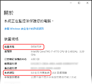 在 [裝置規格] 中,檢視電腦名稱和作業系統版本。