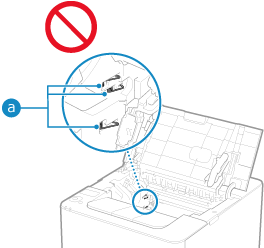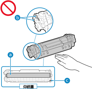 務必使用手柄握住碳粉匣。 請勿刮擦感光鼓表面 (  ) 或暴露在光線下。此外,請勿接觸電子觸點 (  ) 或碳粉匣記憶體 (  )。 |