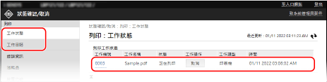 如果以管理員模式登入,會顯示全部列印工作的狀態。